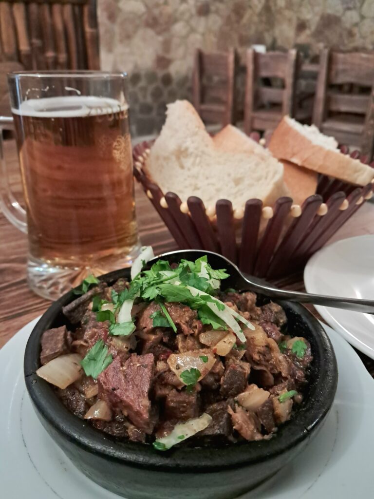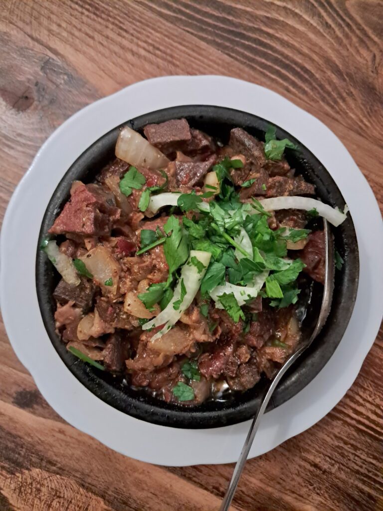 牛や豚、鶏の内蔵にアジカで下味をつけ、たっぷりの油で揚げ焼きにした豪快な料理です。