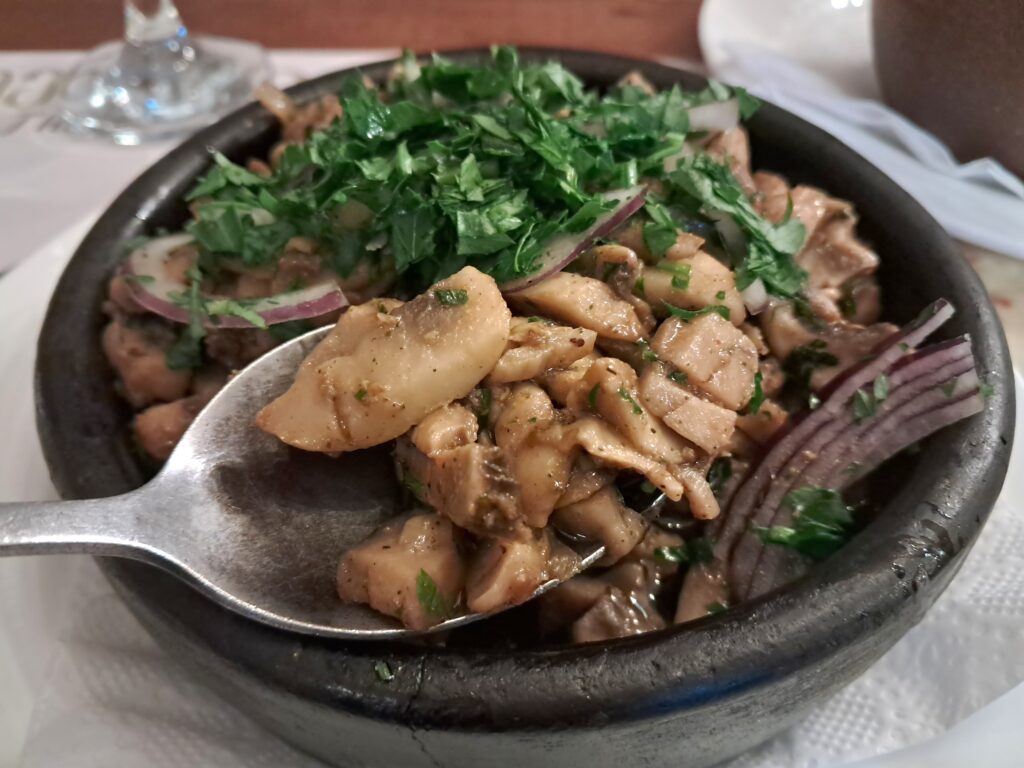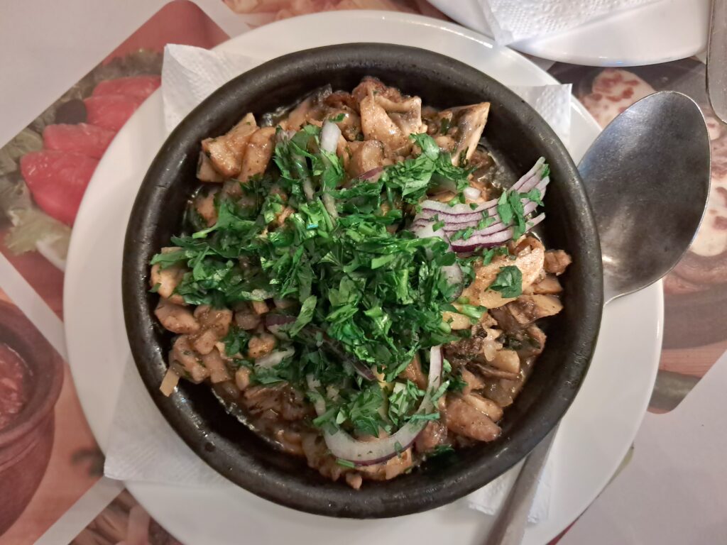 数あるサメグレロ料理の中でものぶよが「うお!美味しい…!」と感動したのが、キノコのクチュマチ(Sokos kuchmach / სოკოს კუჭმაჭი)。