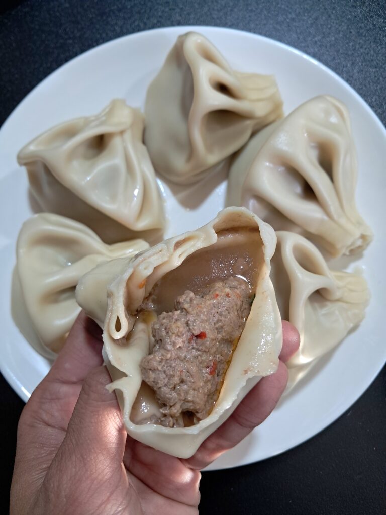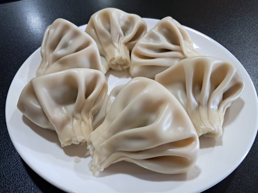 牛と豚の合挽き肉を生地に包んで茹で上げた、水餃子のような料理です。
