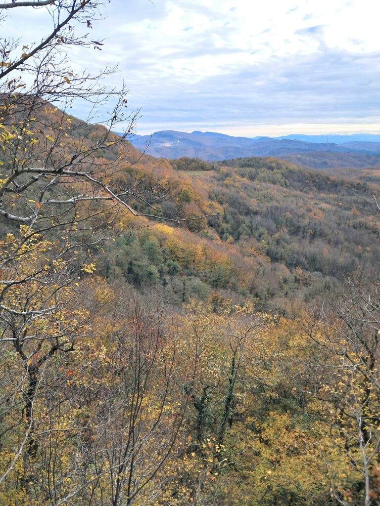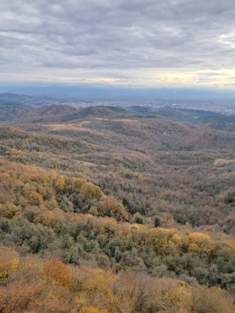 サタプリアの山を覆うコルキスの原生林と、その奥に見えるクタイシ市街地。
